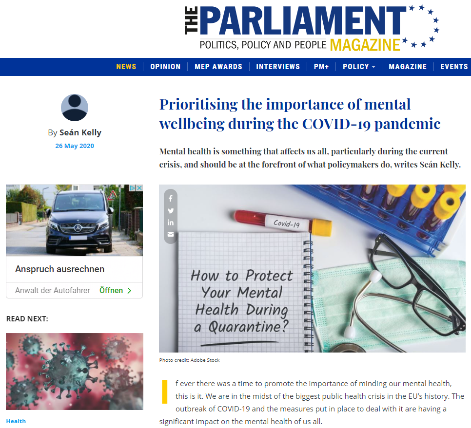 Mental health is something that affects us all, particularly during the current crisis, and should be at the forefront of what policymakers do, writes MEP Seán Kelly. “As a member of the European Parliament’s Coalition for Mental Health and Wellbeing, I strongly believe that mental health needs to be at the centre of our work, particularly when we deal with policies relating to employment, migration and social affairs.”
